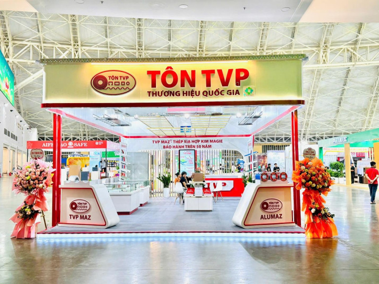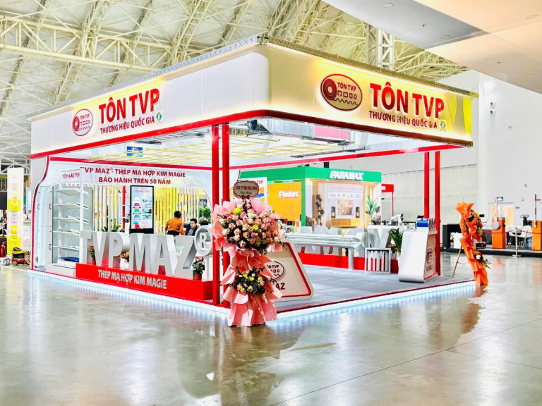 Gian hàng Tôn TVP nổi bật với thiết kế hiện đại, lấy cảm hứng từ sắc đỏ thương hiệu, cùng không gian trưng bày chuyên nghiệp giới thiệu các dòng tôn – thép chất lượng cao, được sản xuất trên dây chuyền mạ và sơn tiên tiến đạt chuẩn quốc tế.