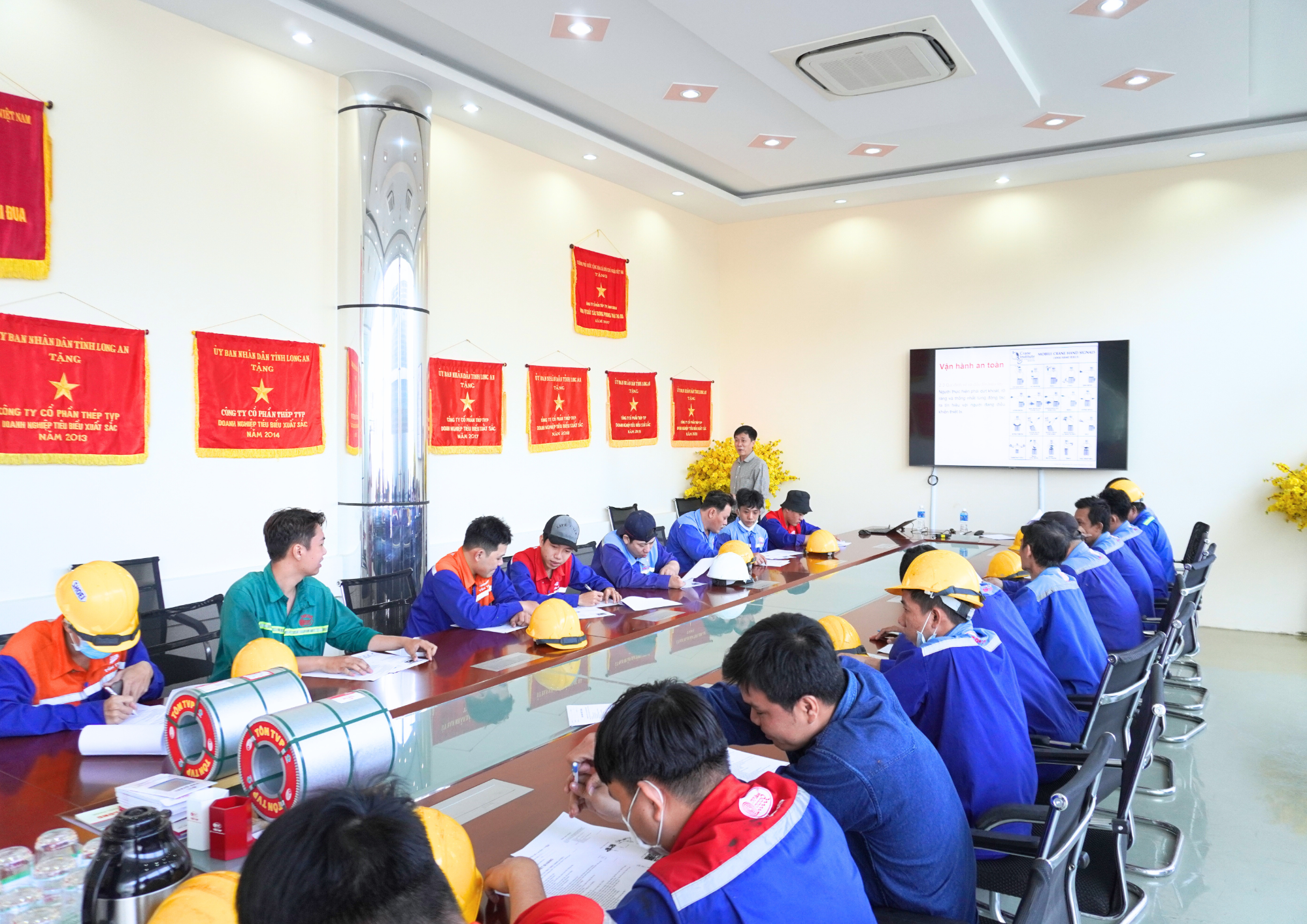 Đào tạo lý thuyết vận hành pa lăng – cẩu trục tại nhà máy Tôn TVP, trang bị kiến thức nền tảng về an toàn và kỹ thuật.