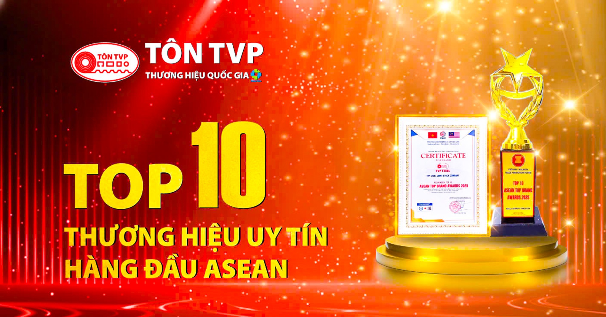 Từ ngày 25 đến 28/10/2025, trong khuôn khổ Hội nghị Thượng đỉnh ASEAN lần thứ 47 và Diễn đàn Xúc tiến Thương mại – Đầu tư Việt Nam – Malaysia 2025 tại thủ đô Kuala Lumpur (Malaysia), Công ty Cổ phần Thép TVP đã vinh dự được trao giải Top 10 Thương hiệu Uy tín Hàng đầu ASEAN 2025. Đây là dấu mốc quan trọng, ghi nhận những nỗ lực không ngừng của doanh nghiệp trong hành trình nâng cao chất lượng, đổi mới công nghệ và xây dựng chuẩn mực sản xuất xanh – bền vững.
